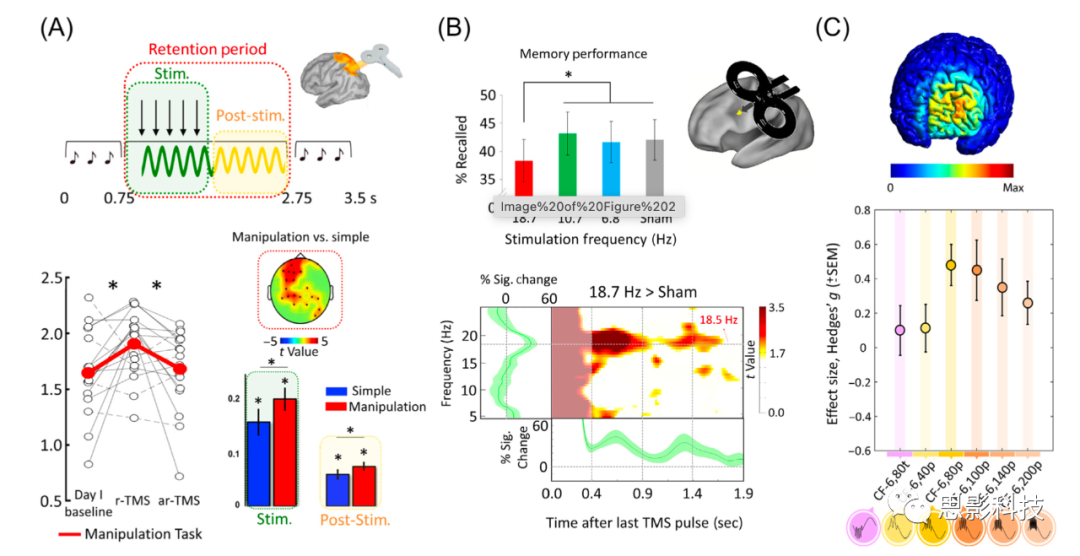 (A)與基線和節(jié)律性經(jīng)顱磁刺激(arhythmic transcranial magnetic stimulation, ar-TMS)相比,在人類(lèi)工作記憶(working memory, WM)任務(wù)中刺激左側(cè)頂葉內(nèi)溝提高了認(rèn)知表現(xiàn)。經(jīng)顱磁刺激(transcranial magnetic stimulation, TMS)脈沖的鎖相腦電圖(electroencephalography, EEG)反應(yīng)比刺激周期延長(zhǎng)約5個(gè)周期(右下)。