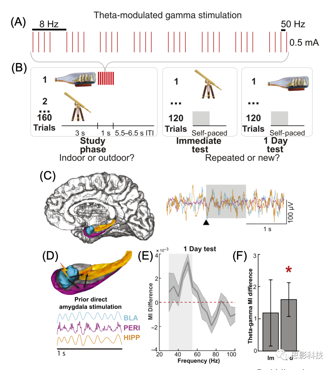 (B)識(shí)別記憶任務(wù)示意圖,在研究階段隨機(jī)刺激一半的物體,并在研究階段后立即和1天對(duì)獨(dú)特的圖像子集進(jìn)行識(shí)別記憶測(cè)試。灰色陰影區(qū)域?qū)?yīng)于識(shí)別測(cè)試期間圖片出現(xiàn)后的前0.5秒,也如面板(C)右側(cè)所示。行為學(xué)結(jié)果表明,對(duì)人類(lèi)杏仁核進(jìn)行短暫的電刺激可以增強(qiáng)隨后的陳述性記憶,而不會(huì)引起情緒反應(yīng)。