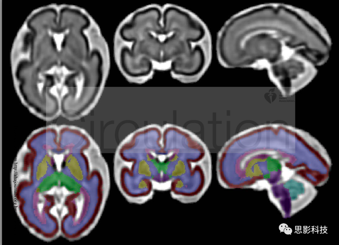 注解 圖1:28周時,在軸向(左)、冠狀面(中)和矢狀面(右)重建胎兒大腦MRI,第二行:大腦結構分割圖示。