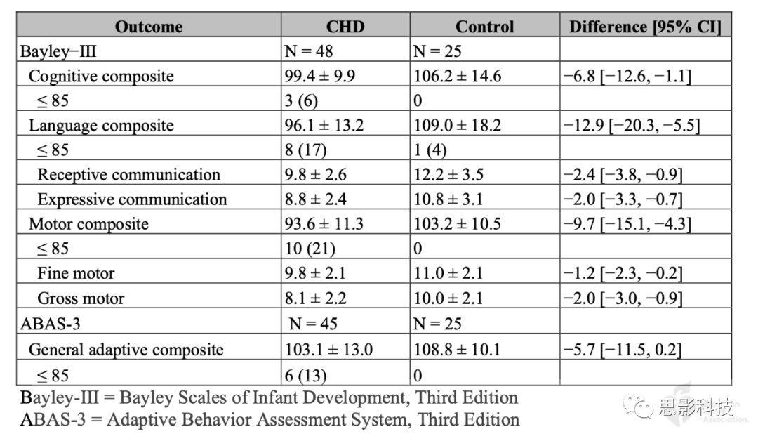 兒童于18-24個月大時接受神經(jīng)發(fā)育評估。通過調查問卷確定了患者及其家庭的人口學特征。貝利嬰幼兒發(fā)展量表第三版(Bayley-III)是一種發(fā)育標準,由一名臨床心理學家(AS)實施。某些情況下,心理學家可能會無視孩子的健康狀況。然而,在一些情況下,由父母透露了他們孩子的心臟狀況,這可能是臨床護理的一部分(占CHD組的33%)。計算認知、語言和運動領域的綜合得分(平均值±標準差:100±15)和子量表得分(10±3)。父母接受了適應性行為評估系統(tǒng)第三版(ABAS-3)評估,這是一種居家觀察的適應性功能標準問卷,從中我們計算了整體適應性功能的綜合得分(GAC:一般適應性綜合得分)。為了評估可能與神經(jīng)發(fā)育結果相關的臨床因素,通過圖表審查提取出生參數(shù)(如出生體重)、心臟解剖和神經(jīng)(如中風/癲癇發(fā)作)數(shù)據(jù)。