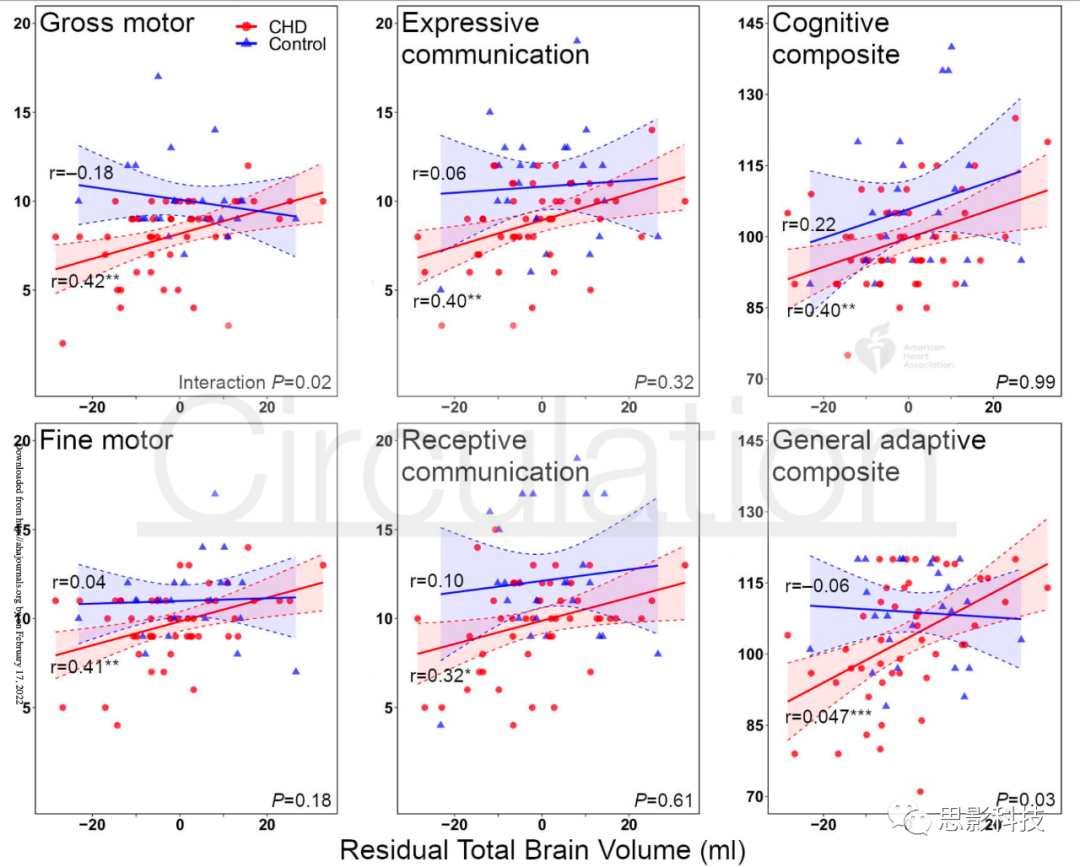 為了解釋妊娠期間胎兒大腦的顯著增長和MRI檢查時的不同胎齡,以及子宮內出現(xiàn)的大腦結構的性別差異,對MRI大腦總體積進行了性別、線性和胎齡校正。全腦體積殘差反映了個體全腦體積與線性回歸期望值之間的差異。對于給定胎齡和性別,大腦體積小于線性回歸預測值的胎兒,其總全腦體積殘差為負值,而根據(jù)回歸方程,大腦體積大于預期值的胎兒,其全腦體積殘差為正值。所有分析都使用了全腦體積殘差,為簡單起見,隨后統(tǒng)稱為“全腦容量”(total brain volume)。通過相關性和相互作用模型評估了各組(CHD組和對照組)全腦體積改變對神經(jīng)發(fā)育預后的潛在影響。