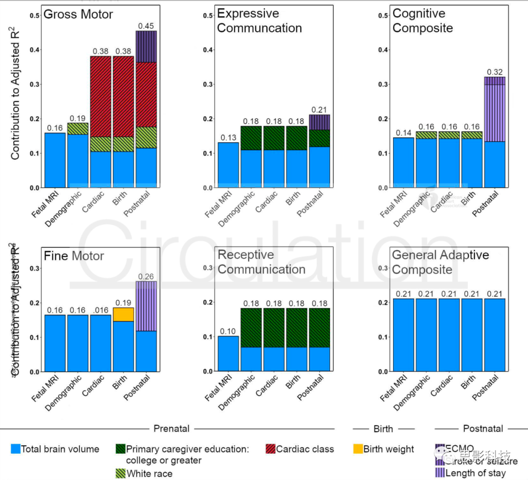 第一階段包括胎兒全腦體積殘差,第二階段可以添加人口統(tǒng)計信息(護理者教育、種族或胎兒性別),第三階段可以添加心臟分級,第四階段可以添加出生體重,第五階段可以添加產后醫(yī)學變量(總維持時間、中風或癲癇發(fā)作、ECMO或住院時間)。