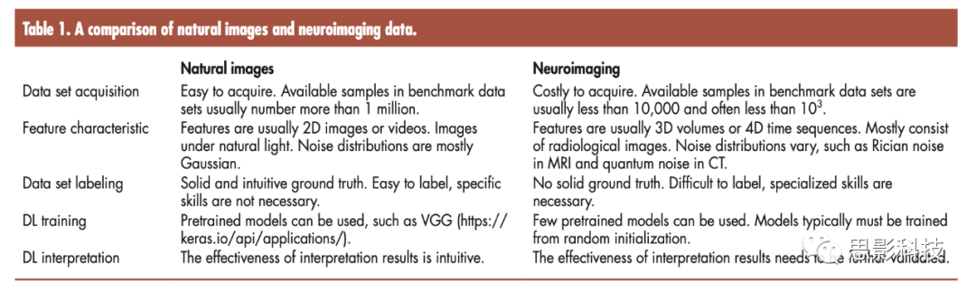 神經(jīng)影像學是一種強大的工具,被用來為健康和功能受損(或結(jié)構(gòu)受損)的人腦提供重要見解,此外,它還具有將新的物理發(fā)現(xiàn)和技術(shù)進步轉(zhuǎn)化為有效診斷、預防和治療腦部疾病的潛力(https://brain initiative . NIH . gov/)。磁共振成像(MRI)和腦磁圖(MEG)等蓬勃發(fā)展的神經(jīng)成像技術(shù)革新了我們無創(chuàng)研究人腦結(jié)構(gòu)、功能、接線和代謝的能力。與在自然光下采集的自然圖像相比,神經(jīng)影像學數(shù)據(jù)主要由放射學圖像組成。因此,神經(jīng)成像的噪聲分布因所用采集而異[例如,MRI中的Rician噪聲、計算機斷層掃描(CT)中的量子噪聲]。如表1所示,與自然圖像數(shù)據(jù)相比,神經(jīng)影像數(shù)據(jù)還具有許多其他獨特的方面,包括模態(tài)的數(shù)量、高維度、低信噪比和小樣本量。