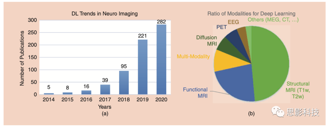 圖1 基于神經(jīng)影像學的DL研究趨勢,圖B中可以看基于MRI的DL研究在神經(jīng)影像學手段中占比最大。
