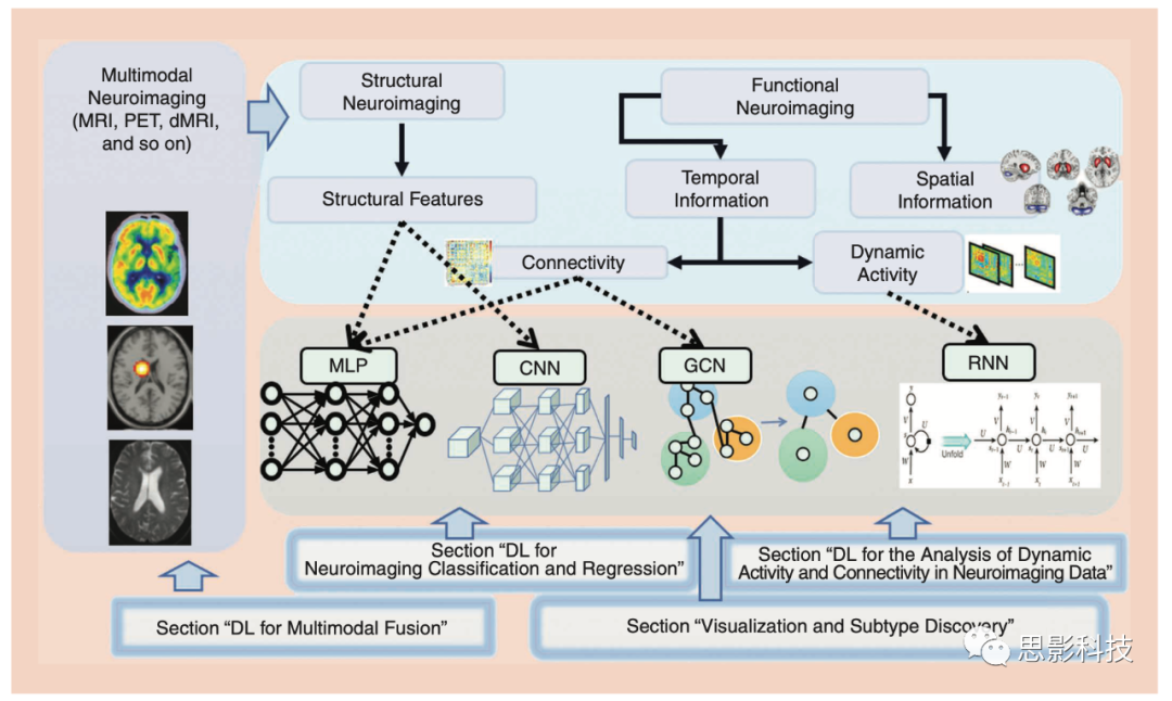 圖2 這篇綜述文章涵蓋了四個相互關(guān)聯(lián)的主題。神經(jīng)影像學數(shù)據(jù)通常從多種模態(tài)中采集,對其進行不同的預處理以提取DL的輸入特征。在灰色面板中,列出了多個DL中涉及的模塊,并與其適用功能進行了鏈接。PET:正電子發(fā)射斷層掃描;dMRI:彌散張量成像 MLP:多層感知器;CNN:卷積神經(jīng)網(wǎng)絡(luò)