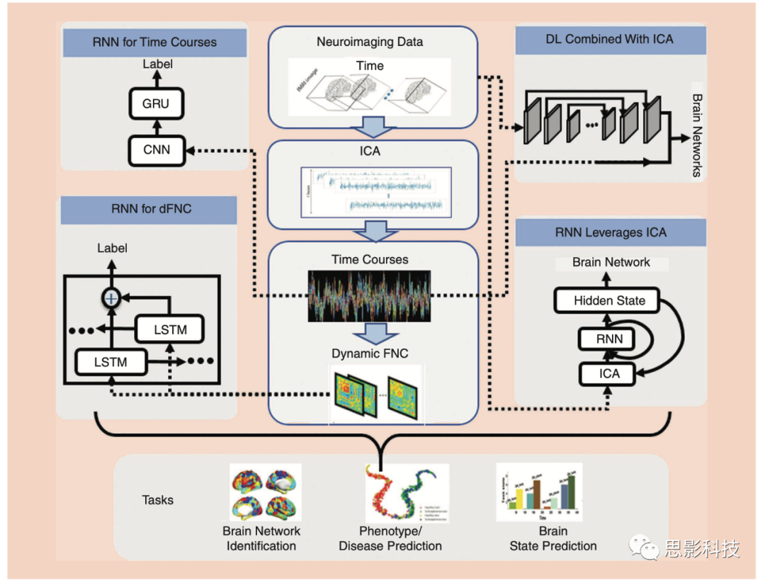 圖3 使用合適的DL模型(例如,RNN)處理來自神經(jīng)成像的數(shù)據(jù),以促進各種任務(wù)(例如,腦網(wǎng)絡(luò)識別)。