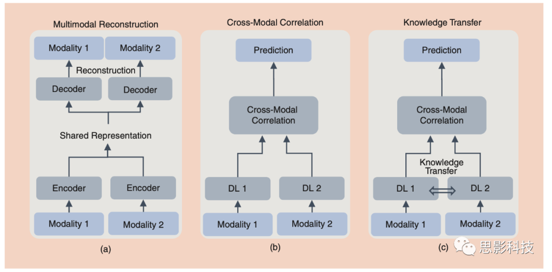 除了基于級聯(lián)的后融合,通過考慮跨模態(tài)關(guān)系,當前已經(jīng)提出了更先進的后融合方法。多模態(tài)重建、深度經(jīng)典相關(guān)分析(DCCA)和基于知識轉(zhuǎn)移的融合是三種流行的多模態(tài)融合方法。如圖4所示,多模態(tài)重建方法采用自動編碼器(AE)來學習最佳的跨模態(tài)表示,從而最好地重建原始數(shù)據(jù)。與標準AE不同,多模式重建通過兩個編碼器學習表示,然后使用共享表示進行重建,這適用于未獲取標簽的無監(jiān)督任務(wù)。獲取跨模態(tài)相關(guān)性或互信息是進行多模態(tài)融合的另一種方式。一個例子是DCCA,它允許兩個DL模型學習新的表示,同時優(yōu)化它們的相關(guān)性。利用知識轉(zhuǎn)移可以進一步提高DCCA融合性能,知識轉(zhuǎn)移保留了相關(guān)特征,并利用了不同模態(tài)之間的信息。