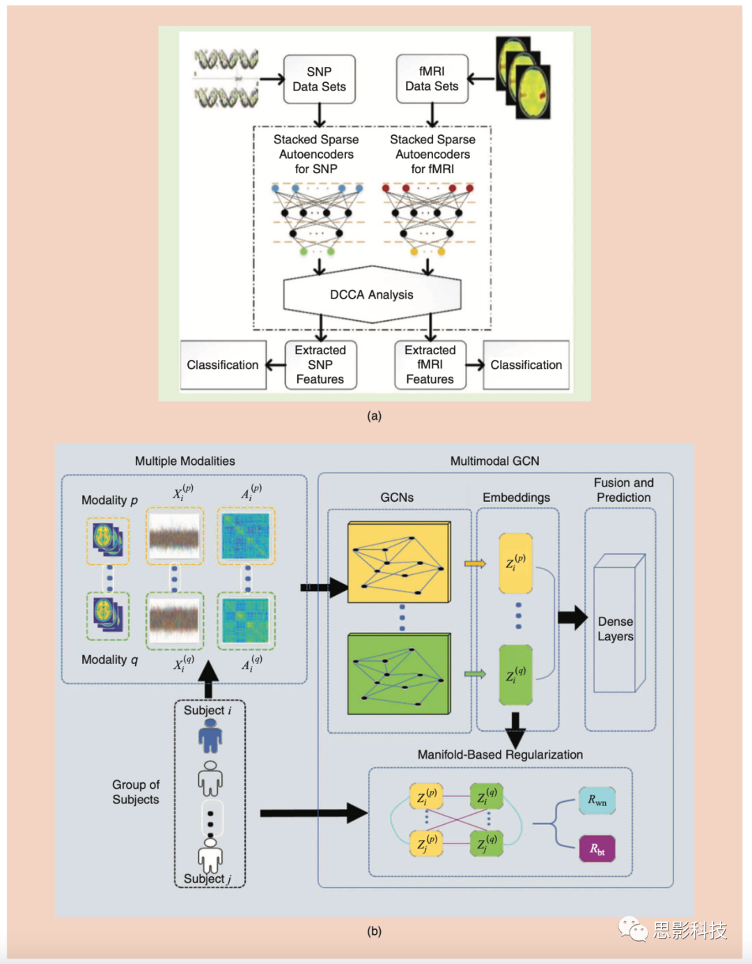 多種神經(jīng)影像學數(shù)據(jù)的可用性和大腦的復雜性導致了許多多模態(tài)融合應(yīng)用。例如,Venugopalan等人通過整合MRI成像數(shù)據(jù)、電子健康記錄數(shù)據(jù)(包括患者和醫(yī)生的縱向信息)和SNP數(shù)據(jù)對前融合和后融合框架進行了比較,以用于阿爾茨海默病的識別。結(jié)果表明,由于數(shù)據(jù)的高度異質(zhì)性,后融合的效果優(yōu)于前融合。其他研究還提出了一些其他最先進的跨模態(tài)表示方法,這些方法可以更好地學習潛在的共享和區(qū)分關(guān)系。深度協(xié)作學習可以將標簽納入DCCA方法。已在靜息態(tài)fMRI和任務(wù)fMRI上得到驗證,在年齡組分類方面表現(xiàn)良好。還有研究提出將AE與DCCA方法相結(jié)合,通過整合fMRI數(shù)據(jù)和SNP數(shù)據(jù)更好地對精神分裂癥進行分類[圖5(a)]。此外,多模態(tài)GCN通過使用流形正則化方法,并考慮模態(tài)內(nèi)和模態(tài)間的受試者關(guān)系,在認知能力預測任務(wù)中取得了較高的成績[19][圖5(b)]。Plis等人提出了一種基于翻譯的融合模型,該模型學習了從sMRI計算的功能性動態(tài)連接和靜態(tài)灰質(zhì)模式之間的聯(lián)系。