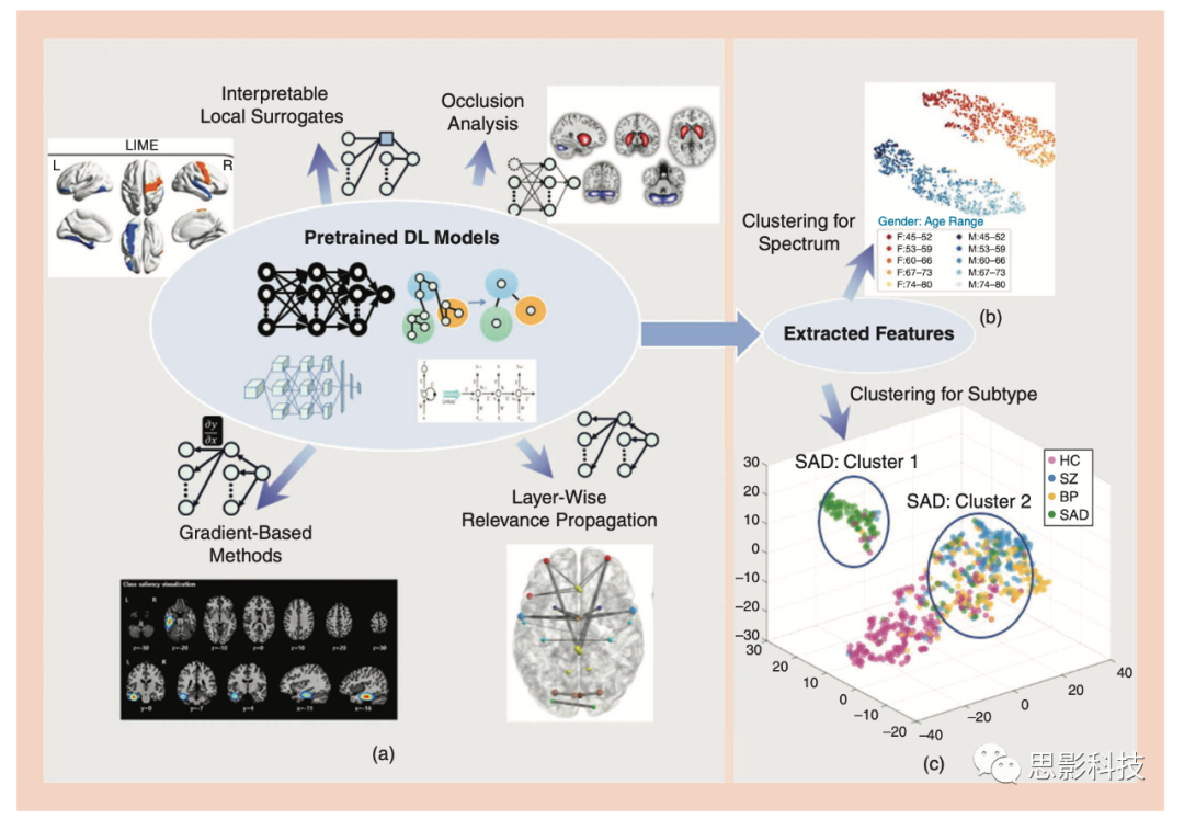 (a) 神經(jīng)成像中的四種DL解釋方法。通過分析預訓練的DL模型,將區(qū)別性特征可視化,以提供對其作為潛在生物標志物的使用的洞察。