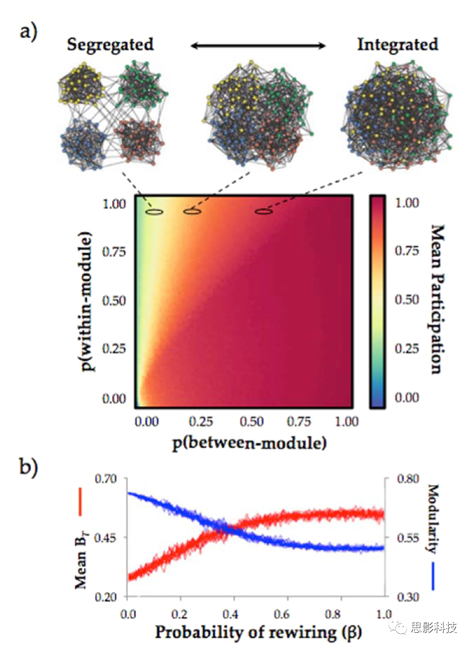 a)模擬120個腦區(qū)的結構網絡拓撲特征,有4個相同大小的模塊(即每個模塊30個腦區(qū)),在途中定義了0(即模塊內部/模塊之間的節(jié)點沒有邊)和1(即模塊內/模塊之間的節(jié)點完全連接)模塊內(y軸)和模塊間(x軸)邊的概率。可以通過計算參數空間的平均參與系數(計算模塊之間連接的強度)來評估每個網絡內的整合程度。1000次迭代的平均結果表明,當模塊間密度大于模塊內密度時,整合度最大;