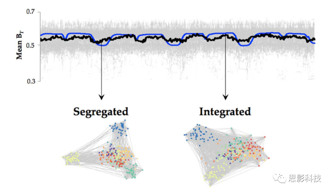功能神經成像實驗為非侵入性的識別區(qū)域間關系在時間維度上的變化提供了一種有效的方法。研究結果表明靜息大腦中整合和分離之間的平衡存在強勁的波動。一項開創(chuàng)性的研究表明,隨著時間的推移,全局大腦信號在高連接強度和低連接強度狀態(tài)之間轉換。由此證明了大腦的網絡結構會隨著時間的推移而波動,以及相對模塊化和整合拓撲架構之間的轉變。鑒于已知的協(xié)調性網絡中模塊化和整合之間的反比關系(圖2),上述結果很可能反映了在拓撲空間上作為兩個極端存在的拓撲狀態(tài)的描述,盡管這種關系不一定適用于其他類型的生物網絡。無論哪種方式,網絡拓撲的動態(tài)變化的認知關聯仍舊不明晰。