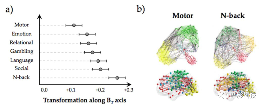 圖 4.網絡重構與任務相關:a)與人類連接組項目的七個獨特任務相關的整合(沿著BTaxis的靜息狀態(tài)特征的轉換)b)簡單運動和認知挑戰(zhàn)('N-back')任務的網絡特征