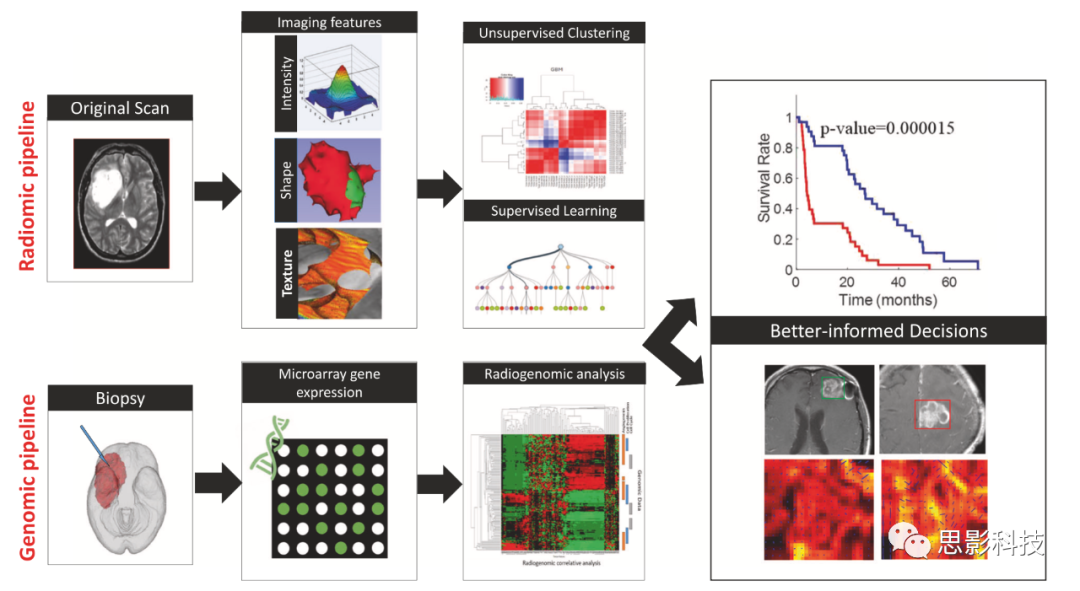 原發(fā)性腦腫瘤的自然病史和預(yù)后因原發(fā)性或繼發(fā)性膠質(zhì)瘤的不同腫瘤行為(低級(jí)別病變的高級(jí)別轉(zhuǎn)化)以及MRI上確定影像性壞死、腫瘤進(jìn)展和假性進(jìn)展的困境而變得復(fù)雜。影像組學(xué)和影像基因組學(xué)有望提供精確診斷、預(yù)測(cè)預(yù)后,并評(píng)估腫瘤對(duì)現(xiàn)代化療、免疫治療和影像治療的反應(yīng)。這是通過形態(tài)學(xué)、紋理和功能特征的三位一體實(shí)現(xiàn)的,這些定量體素級(jí)的高通量特征來自對(duì)MR圖像提取。然而,采集參數(shù)缺乏標(biāo)準(zhǔn)化,研究之間的方法不一致,使得驗(yàn)證不可靠,因此,涉及異質(zhì)研究人群的多中心研究是有必要的。本文闡明了新的影像和影像基因組學(xué)工作流程,以及MR圖像預(yù)處理中最先進(jìn)的方法,以及有關(guān)此類機(jī)器學(xué)習(xí)技術(shù)在腦膠質(zhì)瘤管理中應(yīng)用的研究。本文發(fā)表在British Journal of Cancer雜志。(可添加微信號(hào)siyingyxf或18983979082獲取原文,另思影提供免費(fèi)文獻(xiàn)下載服務(wù),如需要也可添加此微信號(hào)入群,原文也會(huì)在群里發(fā)布)。思影曾做過多期關(guān)于影像組學(xué)的文章解讀,歡迎點(diǎn)擊下文瀏覽: