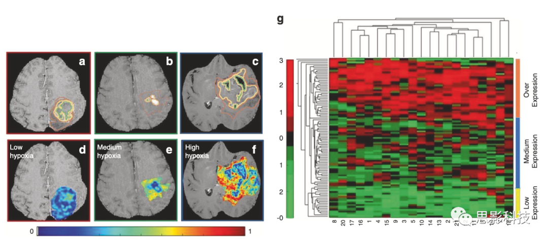 a–c顯示了三名不同GBM患者的2D Gd-T1w MRI切片,分別顯示低、中、高缺氧富集評(píng)分(HES),其中有專家注釋的壞死(綠色輪廓)、增強(qiáng)腫瘤(黃色)和水腫區(qū)域(棕色)。對(duì)于HESlow(d)、Hesmidum(e)和Heshigh(f),相應(yīng)的反向差分矩(Haralick)特征圖已覆蓋在手動(dòng)注釋的腫瘤區(qū)域上; g來自21個(gè)缺氧相關(guān)基因的RNAseq數(shù)據(jù)的無監(jiān)督聚類分為高缺氧(海藍(lán)顯示為Heshigh)、中等缺氧(海藍(lán)顯示為Hesmidum)和低缺氧(黃色顯示為Heslow)。