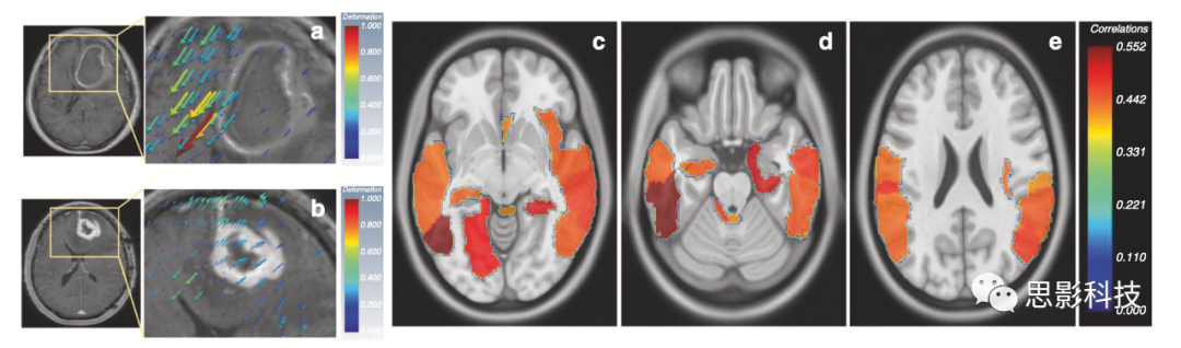 a、 b代表組織位移的變形向量顯示為疊加在右半球GBM圖像切片上的體積渲染3D抖動(dòng)。變形量與抖動(dòng)體積的大小成正比。變形量的較大值分別用“紅色”表示,較小值用“藍(lán)色”表示。震顫還顯示組織移位的方向。