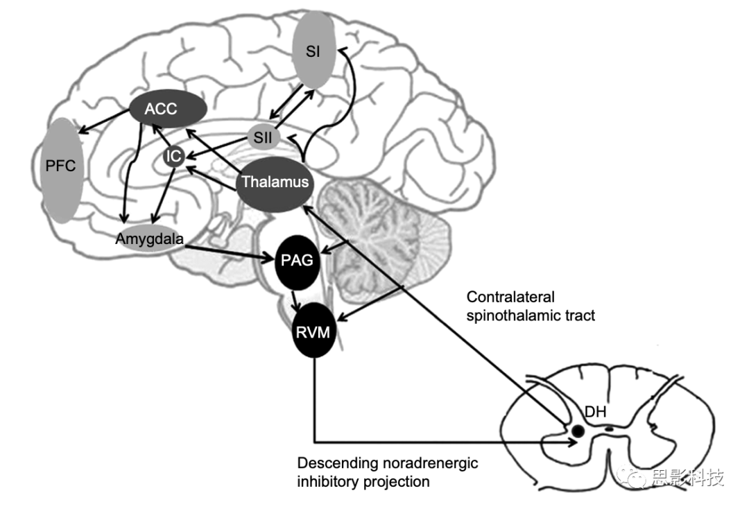 縮寫:DH,背角;RVM,延髓頭端腹側(cè);PAG,導水管周圍灰質(zhì);ACC前扣帶回皮層;IC島葉皮層;PFC前額葉皮層;rACC,嘴側(cè)前扣帶回皮層。