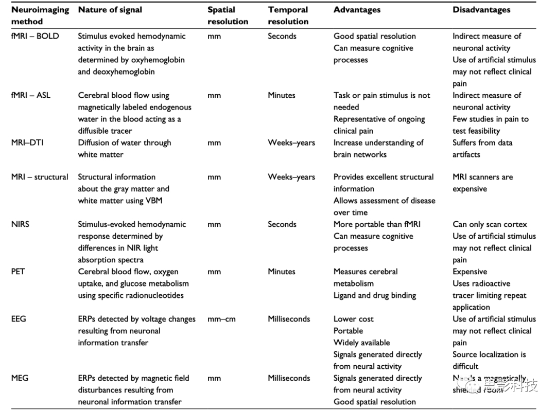 隨著功能性神經(jīng)成像技術(shù)的發(fā)展,極大提高了我們對疼痛的神經(jīng)基礎(chǔ)的理解(表1)。功能性神經(jīng)成像是基于能夠通過測量代謝的任一方面(即血流量、體積、氧氣或葡萄糖代謝)或神經(jīng)化學的一個方面(即神經(jīng)遞質(zhì)前體攝取或受體結(jié)合)的變化來測量神經(jīng)元活動的變化。最常用的技術(shù)依賴于這樣一個前提:大腦活動的增加會導致能量代謝的增加和局部腦血流量(rCBF)的不成比例的增加。
