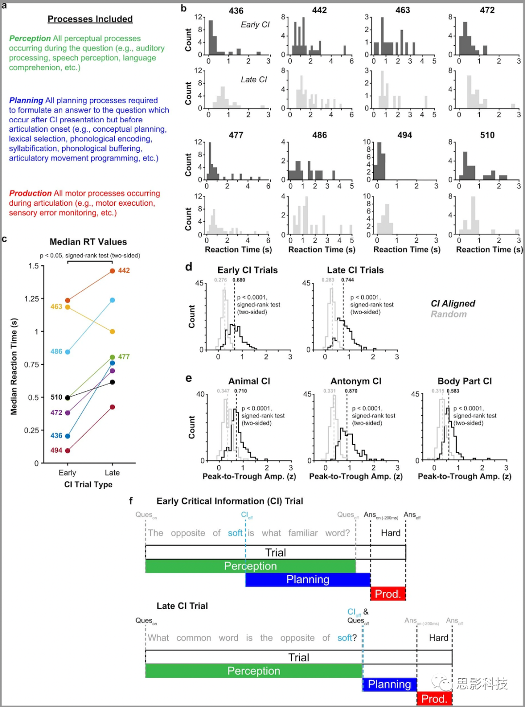 言語規(guī)劃是一種內(nèi)部過程,幾乎或根本沒有行為上的關(guān)聯(lián),通常與自然對話中的言語感知和產(chǎn)生重疊。因此,我們首先試圖從實驗上分離出與對話轉(zhuǎn)換過程中規(guī)劃相關(guān)的神經(jīng)活動。為此,我們采用了一個已建立的問答范式,在這個范式中,一個單詞(即“關(guān)鍵信息”或CI)通過提供正確回答所必需的信息來初始化言語規(guī)劃(圖1c-f)。實驗人員會提出一組39至94個的CI問題給8名參與者(神經(jīng)外科患者志愿者),CI要么出現(xiàn)在問題的中間(“早”),要么出現(xiàn)在問題的末尾(“晚”)。如果語言規(guī)劃是由CI啟動的,晚應(yīng)該比早試次顯示出更長的反應(yīng)潛伏期,因為它們提供相對較少的規(guī)劃時間。正如預(yù)期的那樣,我們觀察到晚期試次的反應(yīng)時間明顯長于早期試次(擴(kuò)展數(shù)據(jù)圖1b,c),表明CI范式暫時隔離了與快速轉(zhuǎn)換相關(guān)的前過程。