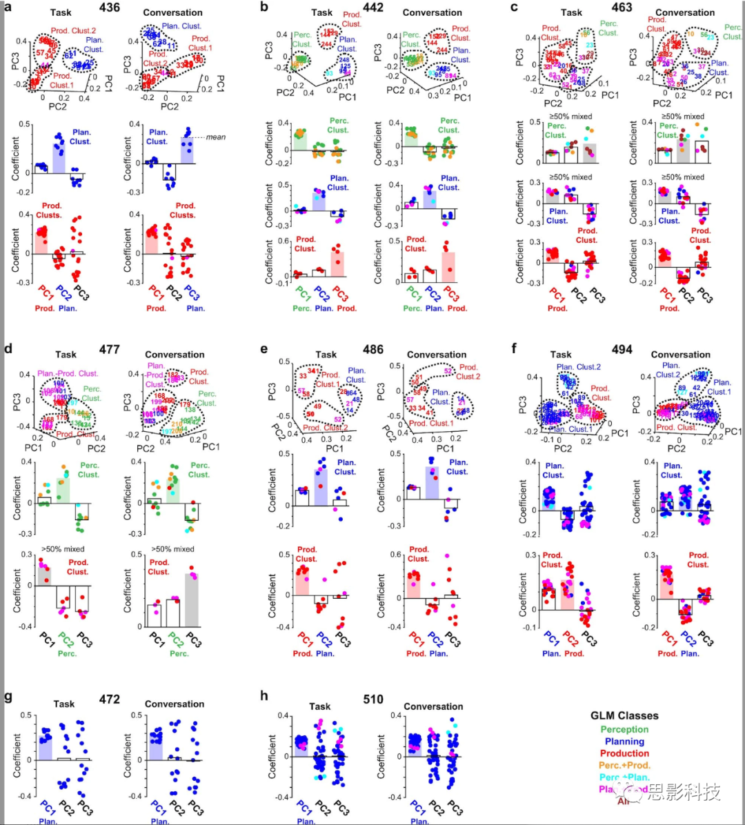 隨后,我們評估了在自然對話中觀察到的PCA活動簇是否與與語音感知、計劃和產(chǎn)生相關(guān)的神經(jīng)反應(yīng)相對應(yīng)。盡管這些功能分類最初是使用GLM進(jìn)行的,GLM在CI任務(wù)的預(yù)定義時間窗口內(nèi)檢測到較高的神經(jīng)活動(圖1),但我們發(fā)現(xiàn)PC系數(shù)空間中的集群絕大多數(shù)由顯示單一類型任務(wù)相關(guān)反應(yīng)的電極組成。我們發(fā)現(xiàn),聚類分類與GLM衍生的活動類之間存在高度的對應(yīng)關(guān)系。因此,使用我們的無監(jiān)督PCA方法,我們揭示了自然對話中對應(yīng)于與CI任務(wù)隔離的不同響應(yīng)類和回路的神經(jīng)活動類別(擴(kuò)展數(shù)據(jù)圖6f)。