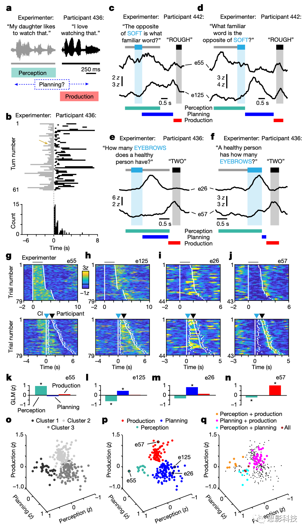 f,在任務(wù)(左)和對話(右)中,皮層表面顯示了參與者(n=6)感知、計劃和產(chǎn)生集群中所有電極的位置。