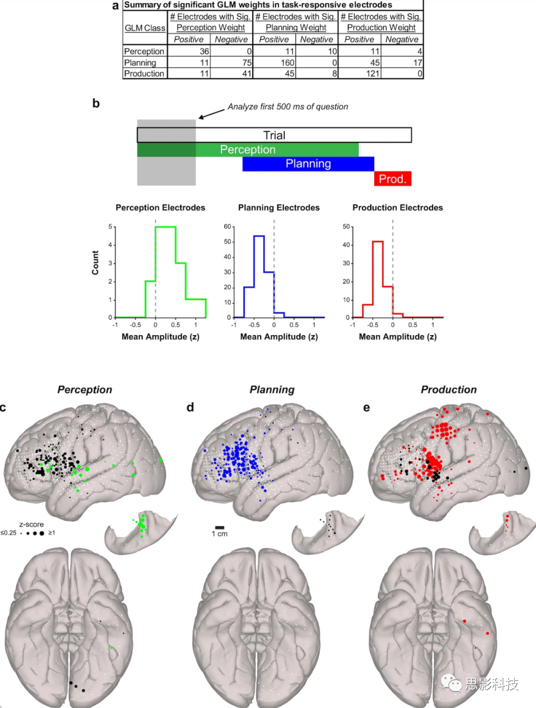 a,表報告了感知、計劃和產(chǎn)生相關(guān)電極的數(shù)量,在每個GLM回歸變量中顯示顯著的正和負(fù)權(quán)重。