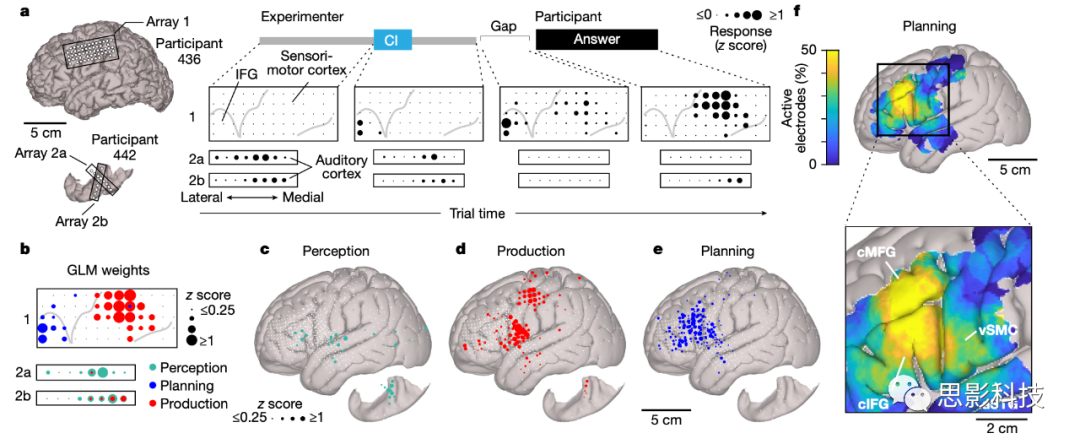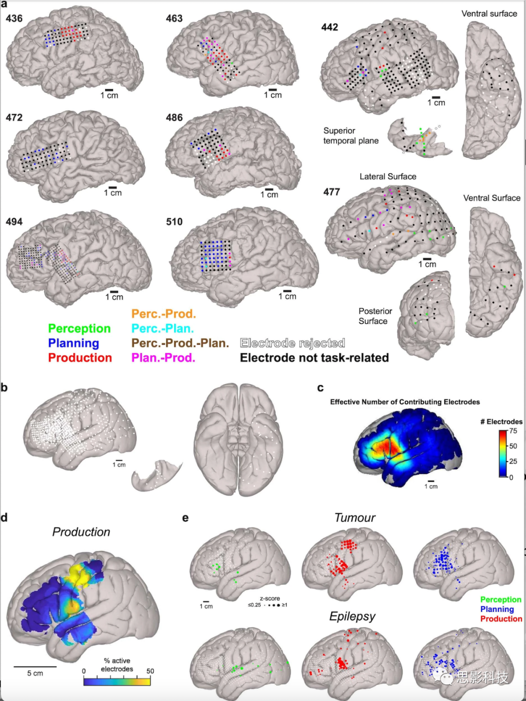 e,分別在腫瘤患者(上)和癲癇患者(下)的典型皮層表面顯示與語言感知、產(chǎn)生和規(guī)劃相關(guān)的顯著反應(yīng)的電極。