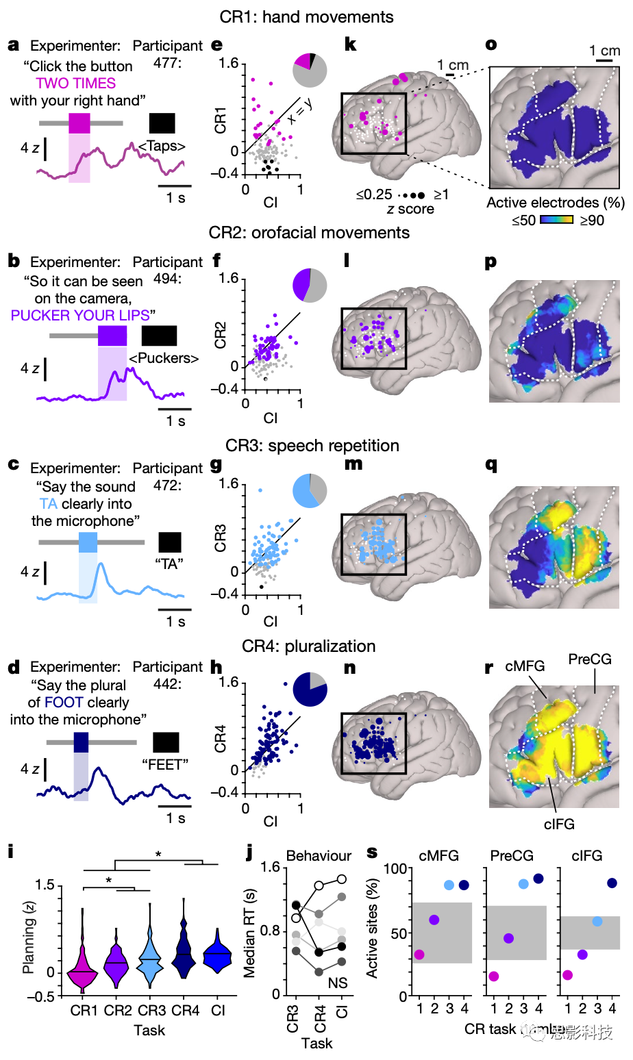 j,在CR3、CR4和CI任務(wù)的后期試次中,中位反應(yīng)時間(RT)沒有顯著差異。k-n,典型皮層表面,指示每項CR任務(wù)的計劃反應(yīng)電極。對特定任務(wù)沒有產(chǎn)生顯著反應(yīng)的電極用白色的小圓圈表示。