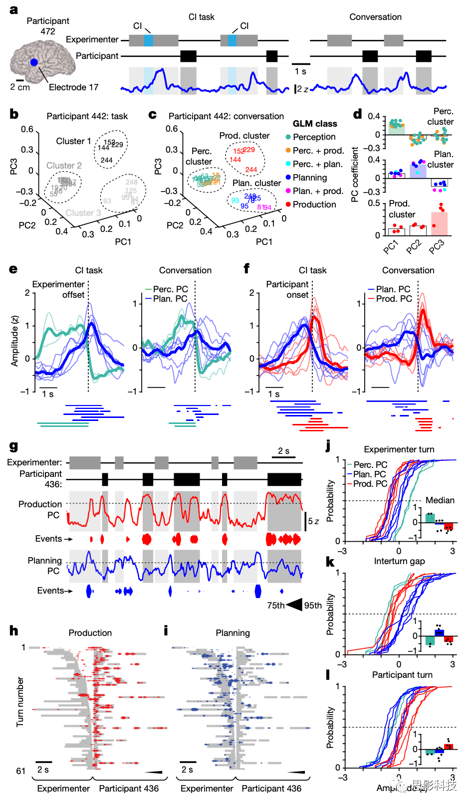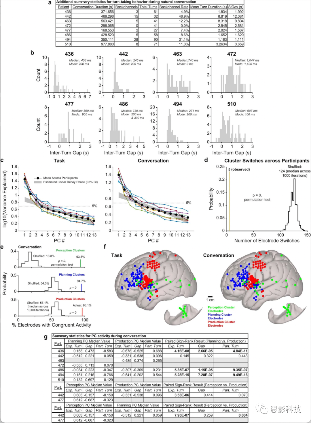 在對話過程中,我們觀察到個體在CI任務(wù)中顯示與計劃相關(guān)的反應(yīng)的電極通常在參與者開始發(fā)言之前被激活(圖4a),這表明這些區(qū)域在這兩種行為中都參與了言語準(zhǔn)備。然而,與我們的互動任務(wù)不同,自然行為中的言語規(guī)劃是高度靈活的,不會暫時鎖定在一個實驗定義的刺激(即CI);這種行為變動性使得對神經(jīng)活動的監(jiān)督分析在很大程度上不可行。為了克服這個問題,我們對連續(xù)電極信號的記錄進(jìn)行了主成分分析。該方法允許我們識別在任務(wù)執(zhí)行和對話過程中獨立顯示相關(guān)信號的電極組,并評估網(wǎng)絡(luò)結(jié)構(gòu)在兩種情境之間是否保持穩(wěn)定。實驗中,我們發(fā)現(xiàn)電極信號在三維主成分(PC)系數(shù)空間內(nèi)形成了三個主簇,表明基于任務(wù)的交互過程中的神經(jīng)活動被組織成不同的類別。然后,我們觀察這種配置是否在非結(jié)構(gòu)化的輪次中保持不變,并發(fā)現(xiàn)電極信號在對話過程中形成了幾乎相同的簇(圖4c,擴(kuò)展數(shù)據(jù)圖7a-f)。具體來說,200個電極中只有5個在參與者的兩種行為之間有不同的聚集,這比預(yù)期的偶然性要少得多。因此,在基于任務(wù)交互的語言生成過程中,活躍的皮層網(wǎng)絡(luò)在自然回合轉(zhuǎn)換過程中也有類似的組織。