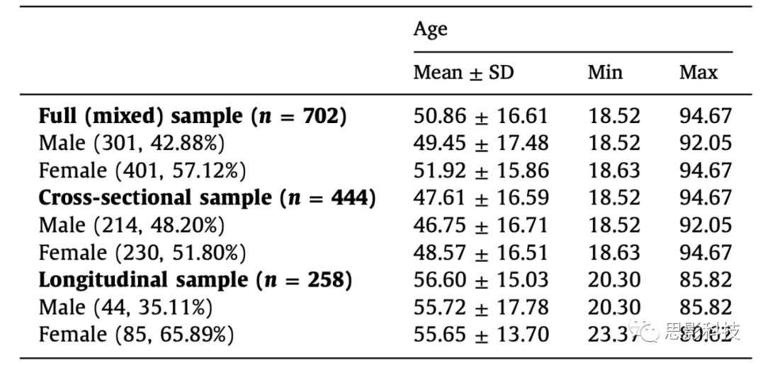 這項研究還包括了一個相對較大的樣本,并受益于所有參與者都接受了相同核磁共振掃描儀的掃描。此外,由于橫斷面研究受到受試者之間的差異和可能存在的隊列效應的限制,目前的研究是橫斷面和縱向混合設(shè)計,其中參試者可以作為他們自己的基線。然而,我們的研究在縱向方面有一些局限性,包括間隔時間較短,以及與橫斷面樣本相比樣本量較小。因此,主要結(jié)果主要是由橫斷面數(shù)據(jù)驅(qū)動的。未來的研究應該著眼于在幾個時間點上采用完全縱向設(shè)計,以便評估個體隨時間變化的差異,最好是在較大的年齡范圍內(nèi)。