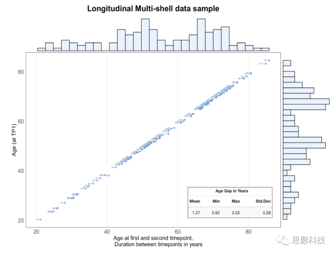 最初的樣本包括來自兩項綜合研究的754個健康受試者的多殼dMRI數(shù)據(jù)集。在質(zhì)量檢測(QC)后刪除52個數(shù)據(jù)集之后,最終樣本包括來自573個個體的702個數(shù)據(jù)集,包括129名參與者的縱向數(shù)據(jù)(兩個時間點,平均間隔=15.2個月)。人口統(tǒng)計信息匯總在表1和圖1中。