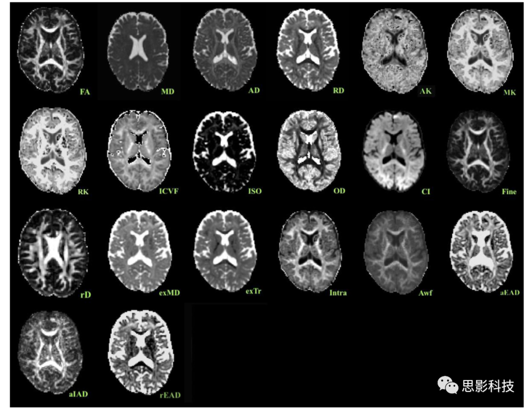 DTI:FA(各向異性分數(shù))、MD(平均擴散系數(shù))、AD(軸向擴散系數(shù))、RD(徑向擴散系數(shù))。