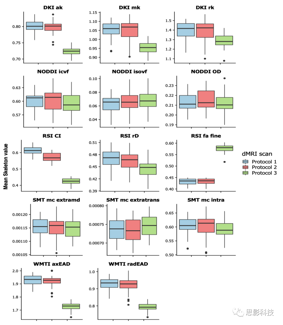 不同擴散模型的有效性和敏感性主要取決于用于模型擬合的數(shù)據(jù)的豐富性、質(zhì)量和特性。為了評估研究中使用的高級指標的重復性,使用從不同采集方案中獲得的數(shù)據(jù)來估計dMRI模型,這些數(shù)據(jù)來自23個平均年齡為35.77歲的健康受試者。這代表了整個樣本的一個子樣本。比較了以下三種采集方案:1)b=[1000,2000]與[60,30]個方向,與主要分析中使用的采集方案相同;2)b=[1000,2000]與[60,60]個方向;3) b=[1000,2000,3000]與[60,60,60]個方向。對于每個方案,使用與前文敘述的方法的相同的處理數(shù)據(jù)方式,并提取每個指標的平均骨架值。采集方案之間的比較是使用三種采集協(xié)議獲得的每種指標平均骨架值的箱式圖(SI圖4)、年齡作為平均骨架值函數(shù)的自變量的散點圖(SI圖5)以及皮爾遜相關(guān)系數(shù)圖(SI圖6)進行的,其中方案1由方案3分解得出。(僅展示SI圖4供讀者理解)。
