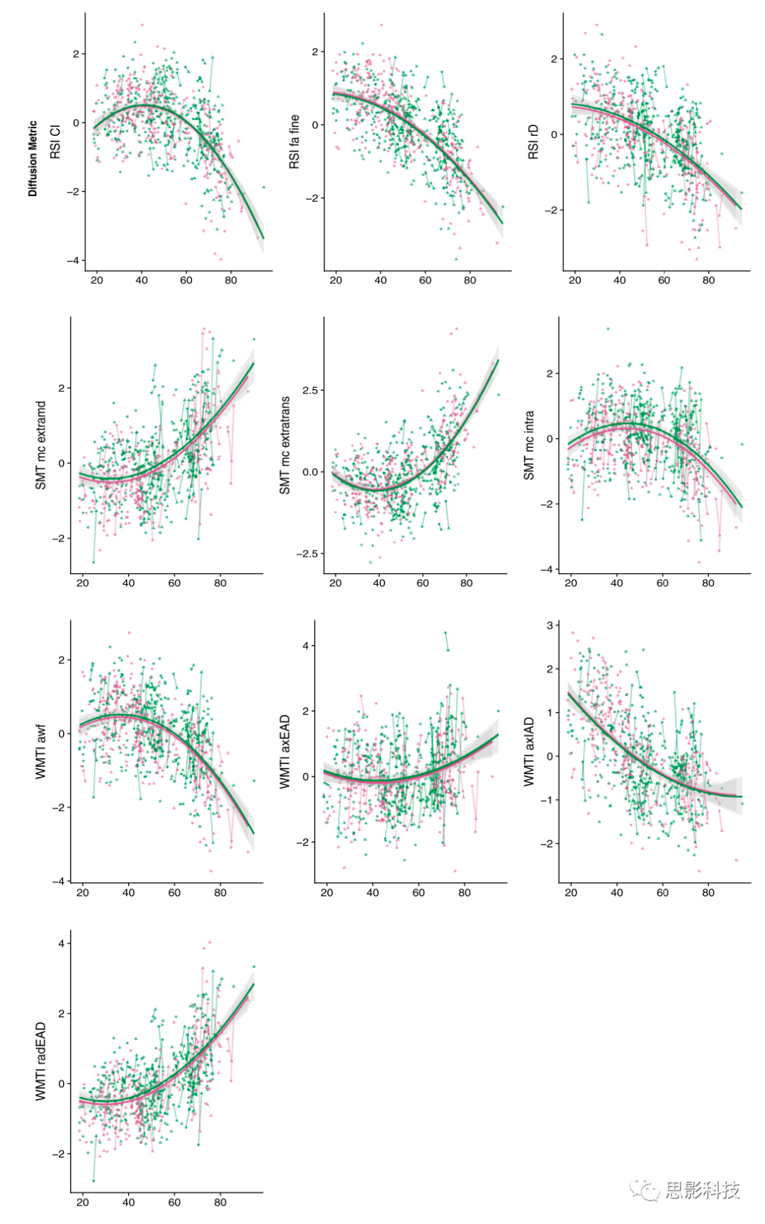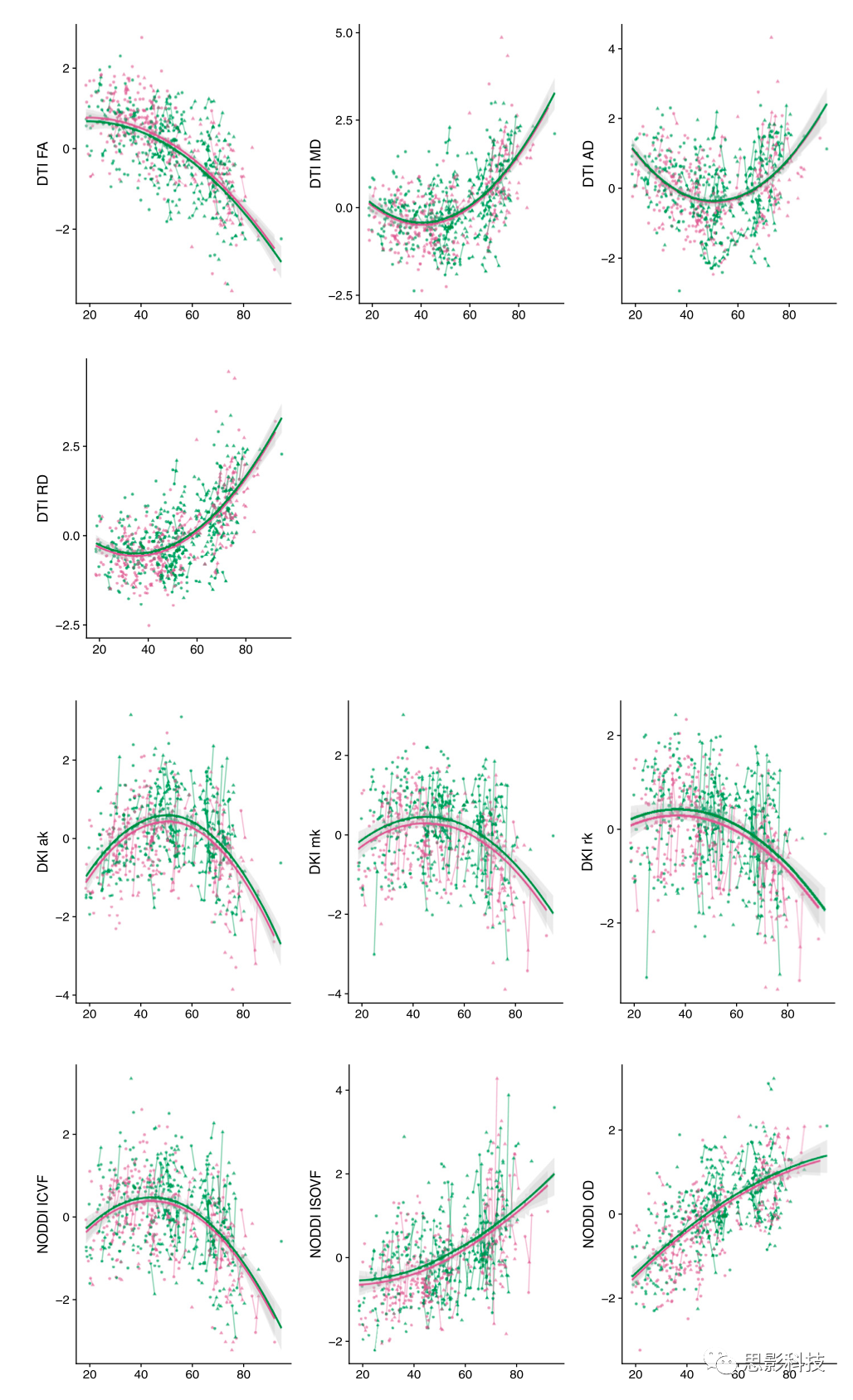 圖3:年齡曲線,其中每個擴散度量的標準化(z分數(shù))平均骨架值(y軸)被繪制為年齡(x軸)的函數(shù)。用lme得出預測值擬合線。陰影區(qū)域代表95%的可信區(qū)間。由直線連接的點表示縱向數(shù)據(jù),其中圓形是第一個時間點,三角形是第二個時間點。男性受試者用粉色表示,女性受試者用綠色表示。