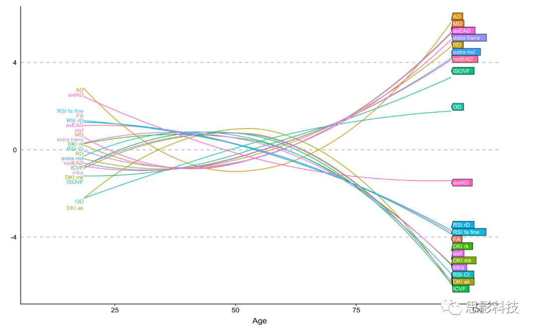 圖3顯示了所有指標的估計年齡曲線。簡而言之,FA在30歲后穩(wěn)步下降,50歲后下降幅度更大。MD、AD和RD遵循相反的變化規(guī)律,在40歲左右前減小,此后軌跡增加。DKI的指標都顯示出曲線形軌跡,NODDI的ICVF指標、RSI的CI指標、SMT mc 的intra指標和WMTI的awf指標也都遵循類似的軌跡。RSI的rD指標、RSI的FA fine指標和WMTI的 axIAD指標遵循從始至終的遞減軌跡。SMT mc的 exMD和exTr指標,以及WMTI的radEAD指標遵循與MD和RD相似的軌跡。NODDI的OD指標和ISOFV指標顯示出隨著年齡的增長,其中OD指標的斜率降低成相對穩(wěn)定的變化。最后,WMTI的 axEAD指標顯示出U形軌跡。