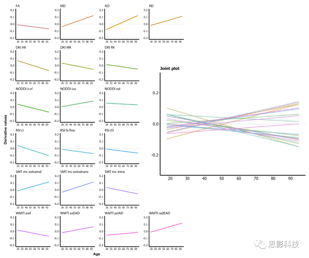 圖5:每個擴散模型的導數(shù),提供每個點的估計變化率。X軸上擬合線在y軸上與0相交的點表示每個指標的年齡軌跡的轉(zhuǎn)折點。