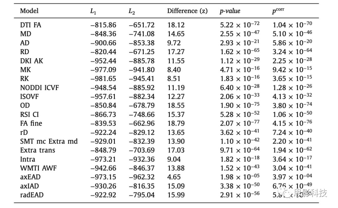 表3顯示了通過似然值差異估計每個指標的整體年齡依賴性。所有指標均表現(xiàn)出顯著的年齡依賴性,其中RSI的FA fine是最敏感的年齡指標,其次是NODDI 的OD指標和基于DTI的FA指標。WMTI的axEAD是年齡依賴性最小的指標。