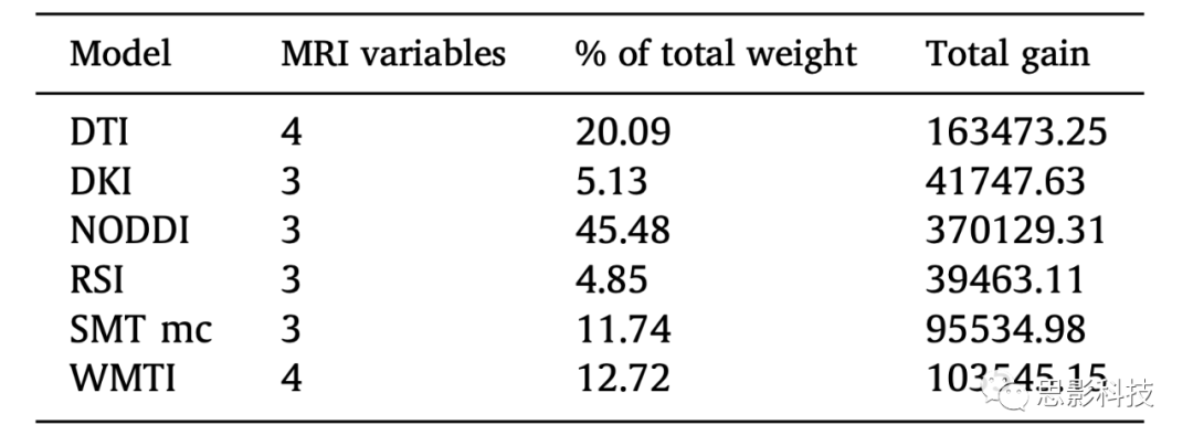 為了評估每個擴散模型在多模態(tài)模型中的重要性,我們使用了一個額外的預測模型,該模型只包括平均骨架值以減少回歸的輸入中高度相關(guān)的特征的數(shù)量,而后計算了每個模態(tài)貢獻的總權(quán)重的比例,其中,總權(quán)重表示一個特征在所有(決策)樹上都被用于分割數(shù)據(jù)的次數(shù)。又計算了增益值,它表示將一個特征添加到它所在的分支上之后,精度提高的程度。為了評估總體模型性能的顯著性,使用重復10次的分成10份的交叉驗證計算了多模態(tài)模型的平均均方根誤差,并與隨機1000次的置換檢驗的零分布進行了比較。