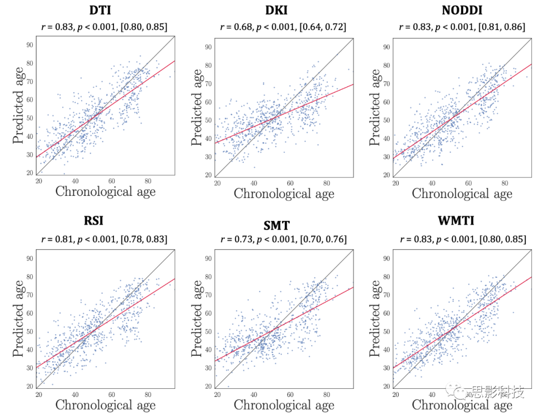 在神經(jīng)成像大數(shù)據(jù)帶來的機會的基礎(chǔ)上,最近許多研究者利用機器學習技術(shù)研究了與年齡相關(guān)的大腦變化,例如腦齡預測;根據(jù)神經(jīng)成像數(shù)據(jù)估計大腦的“生物”年齡。預測大腦的年齡,然后觀察預測的年齡和實際年齡之間的差異,可以生成一個用來表示大腦完整性的重要個性化標記,這些標記可能能夠揭示神經(jīng)和神經(jīng)精神障礙的風險。雖然腦齡預測在最近幾年變得更加流行,但大多數(shù)研究都使用了灰質(zhì)特征來預測腦年齡,只有少數(shù)研究專門使用或部分使用了dMRI。并且,RSI和NODDI等高級擴散模型的腦齡預測精度尚不清楚。