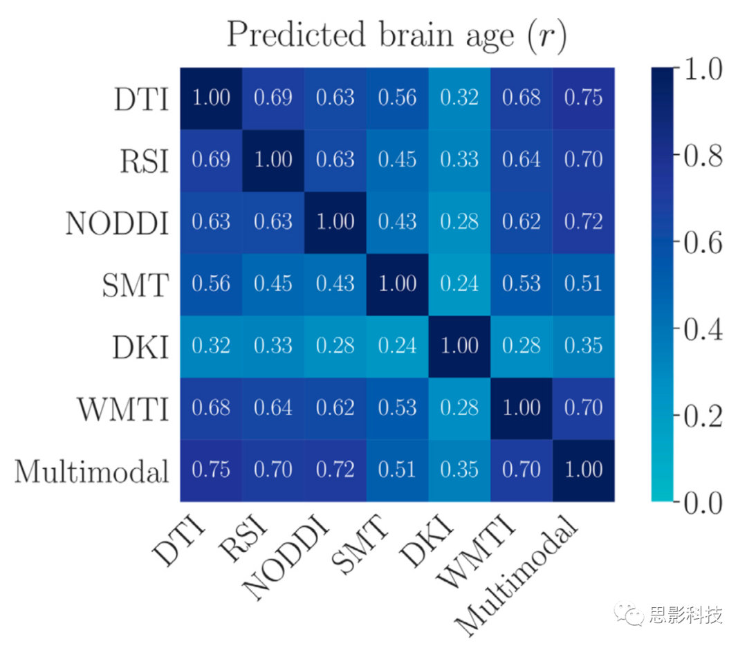 圖6:每個模態(tài)和多模態(tài)模型的腦齡預測的相關(guān)矩陣