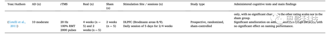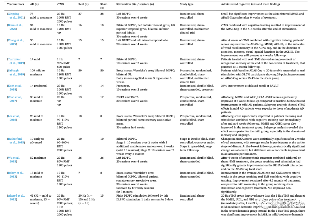 表1 AD 中的 rTMS 研究:研究參與者、rTMS 方案和臨床結(jié)果測量。