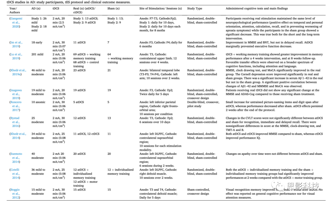 另一方面,低強度經(jīng)顱電刺激 (transcranial Electric Stimulation, tES) 利用不同極性的表面電極(陽極或陰極)通過完整頭皮傳遞電流,從而調(diào)節(jié)神經(jīng)元或軸突膜的極化(去極化或超極化低于尖峰閾值)。電極放置在浸泡于鹽溶液或其他導(dǎo)電方式的海綿中,根據(jù)刺激的強度和持續(xù)時間,電極會增加(陽極anodal-atDCS)或降低(陰極cathodal-ctDCS)神經(jīng)元放電的可能性,這與 TMS 不同,TMS直接誘導(dǎo)神經(jīng)放電。輸送電流的不同形式構(gòu)成了 tES 的 3 種形式:經(jīng)顱直流電刺激 (transcranial Direct Current stimulation, tDCS)、經(jīng)顱交流電刺激 (transcranial Alternating Current Stimulation, tACS) 和 tACS 的子形式:經(jīng)顱隨機噪聲刺激 (transcranial Random Noise Stimulation, tRNS),在tRNS中施加頻率和強度隨機變化的低振蕩電流。大多數(shù)AD 中 tES 的研究都是使用 tDCS。迄今為止,基于動物模型的證據(jù),且目前還沒有研究將tRNS用于AD。表2概述了tDCS應(yīng)用于AD的主要隨機、多療程、假刺激對照試驗的方案和結(jié)果。