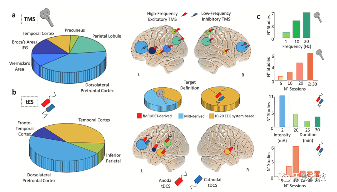 圖1. AD 中過去和現(xiàn)在的 NiBS 應(yīng)用。過去 10 年 TMS (a) 和 tES (b) 多療程、假刺激對照研究中最常見的刺激部位以餅圖和大腦表面的形式呈現(xiàn)。點的大小與靶向每個區(qū)域的研究數(shù)量成正比。大多數(shù) TMS 研究都采用了高頻刺激方案(模式化 5-20 Hz 刺激),而很少有 tES 研究比較靶向同一區(qū)域的陽極和陰極刺激的效果??傮w而言,很少有研究使用基于MRI神經(jīng)導(dǎo)航的刺激方案,也沒有研究利用功能磁共振成像 (functional magnetic resonance imaging, fMRI) 或正電子發(fā)射斷層掃描 (positron emission tomography, PET) 來指導(dǎo)靶點選擇。(c)還報告了 TMS 和 tES 的刺激參數(shù)和不同研究的總療程數(shù)的詳細(xì)信息。