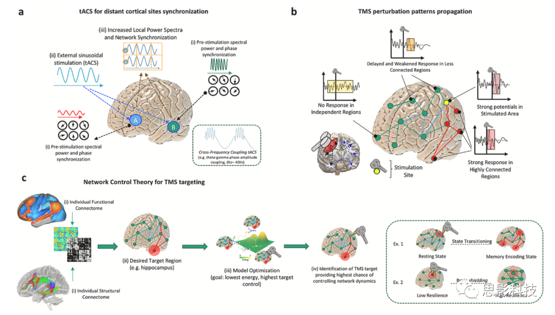另一個可能有助于AD 中網(wǎng)絡(luò)引導(dǎo)刺激方法的研究領(lǐng)域是網(wǎng)絡(luò)組織和結(jié)構(gòu)的數(shù)學(xué)研究,例如圖論和網(wǎng)絡(luò)控制理論方法。前者處理的是可以簡化網(wǎng)絡(luò)中信息傳輸?shù)膱D構(gòu)造的拓?fù)涮匦?,而后者處理網(wǎng)絡(luò)可控性和狀態(tài)到狀態(tài)傳輸背后的理論,兩者都對 AD 的 NiBS 方法具有多重含義(圖2c)。從數(shù)學(xué)角度研究節(jié)點屬性可以提供信息,例如,確定一個區(qū)域在網(wǎng)絡(luò)功能中發(fā)揮核心作用的可能性,或?qū)⑾到y(tǒng)引導(dǎo)至所需狀態(tài)所需的能量數(shù)量并進一步得到投入產(chǎn)出的能源成本。最重要的是,這些原則可能適用于促進大腦狀態(tài)的轉(zhuǎn)換,例如從基線靜息態(tài)到活躍的認(rèn)知過程(例如記憶編碼狀態(tài)),或者再次提高網(wǎng)絡(luò)對外部“擾動(定義為任何能夠改變大腦結(jié)構(gòu)和/或功能的短暫或持續(xù)事件,如腦萎縮、局部蛋白質(zhì)堆積、代謝減退)”的彈性(圖 2c)。重要的是,網(wǎng)絡(luò)理論衍生的靶點不同于傳統(tǒng)的刺激位點,因為它們解釋了個體大腦的固有拓?fù)涮匦?,并利用信息模型來預(yù)測響應(yīng)輸出。計算機模型已經(jīng)證明了使用控制理論可以檢測節(jié)點在大腦可控性中的作用,并可能使節(jié)點采取行動從而與病理神經(jīng)元相互作用(例如 AD 相關(guān)的EEG活動變化)。然而,人類對這些理論框架的因果驗證仍然缺乏。到目前為止,NiBS 可能代表了以因果方式測試此類理論預(yù)測的最有希望的非侵入性方法。