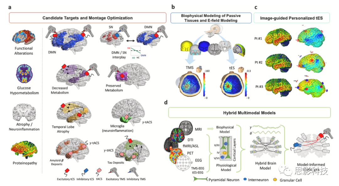 (b) AD病理的異質(zhì)性進一步要求通過高度個性化的montage來實現(xiàn)靶向,該montage考慮到個體的大腦形態(tài)和組織特征(萎縮、CSF等)。