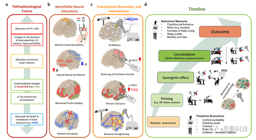 在 AD 的病理生理過程的早期,由于神經(jīng)元間反應(yīng)和突觸傳遞的改變導(dǎo)致興奮/抑制平衡發(fā)生了變化,這可以通過 TMS 衍生的皮質(zhì)興奮性測量來檢測。TMS-EEG 的聯(lián)合使用可能有助于將皮層改變的檢測范圍擴大到運動皮層之外,并可能刺激殘余可塑性機制(圖 4a-c,第一行)。腦振蕩的病理變化——即EEG節(jié)律背后的網(wǎng)絡(luò)——也是 AD 病程的特征,高頻帶的表達減少,有利于較慢的振蕩。未來的研究應(yīng)該測試使用 tACS 來促進健康的大腦模式(例如通過增加alpha 活動) (圖 4a-c,第 2 行)。此外,現(xiàn)在正在測試gamma頻率tACS 作為對神經(jīng)炎癥過程起作用的潛在干預(yù)措施,這進一步代表了 AD 病理過程中的關(guān)鍵步驟(圖 4a-c,第 3 行)。由于腦萎縮和蛋白質(zhì)病的模式似乎沿著已知的神經(jīng)網(wǎng)絡(luò)(例如,DMN)發(fā)生,未來的干預(yù)措施可能會利用大腦拓?fù)浣M織知識來指導(dǎo)干預(yù)措施,以解決改變的網(wǎng)絡(luò)動態(tài)性(圖 4a-c,第 4 行)。最后,NiBS 可通過啟動或協(xié)同方法來增強大腦的接受能力,其中 NiBS 干預(yù)與專門的認(rèn)知任務(wù)相結(jié)合。未來的干預(yù)措施可能會進一步擴大在大腦特別接受狀態(tài)期間使用此類方法,例如在睡眠期間(圖 4d)。