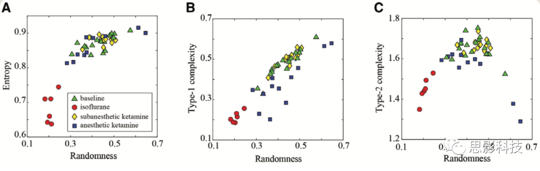至于大腦和麻醉,復(fù)雜度指數(shù)的最佳選擇尚不清楚,但應(yīng)該是意識最全面時復(fù)雜度最大。如果我們使用單一腦電圖通道的時間復(fù)雜度來估計大腦狀態(tài)庫的大小,那么類型1指數(shù)(如Lempel-Ziv復(fù)雜度、排列熵和近似熵)似乎非常有效。麻醉無反應(yīng)通常與α和δ腦電圖振蕩增加有關(guān),因此以平坦功率譜的喪失為標志。然而,這種情況與致幻狀態(tài)的關(guān)系就不太清楚了,在致幻狀態(tài)中,1型指數(shù)通常大于其非致幻清醒值。例如,圖1顯示了麻醉和亞麻醉劑量的異氟烷和氯胺酮如何改變1型和2型復(fù)雜度。可以看出,1型復(fù)雜度不能將氯胺酮麻醉與基線清醒狀態(tài)區(qū)分開來,事實上可能會顯示出麻醉氯胺酮的一些非常錯誤的高值(參見圖右側(cè)的兩個藍色方塊),而2型復(fù)雜度正確地將低值歸為這些點。