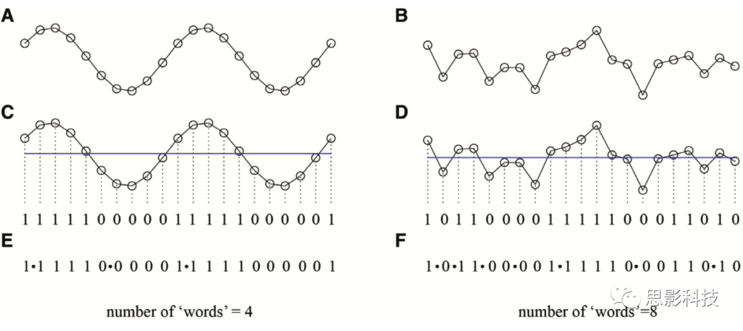 本質(zhì)上,Lempel-Ziv復(fù)雜度算法量化了符號序列的可壓縮程度。復(fù)雜信號是一種不容易概括的信號。Lempel-Ziv復(fù)雜度是1類復(fù)雜度。圖3描述了推導(dǎo)簡單信號的Lempel-Ziv復(fù)雜度的分析過程的細節(jié)。首先,對腦電信號進行閾值化處理,生成1和0的二進制序列,將其擴展到少量符號序列,這些序列可以被視為“單詞”(圖3,C和D)。然后,該算法通過評估之前歷史的不可再現(xiàn)性來計算新單詞的數(shù)量(圖3,E和F),我們可以看到一個規(guī)則或簡單信號只有四種類型的單詞,而復(fù)雜或不規(guī)則信號的多樣性更大,有八種序列或單詞,因此有更高的Lempel-Ziv復(fù)雜度。