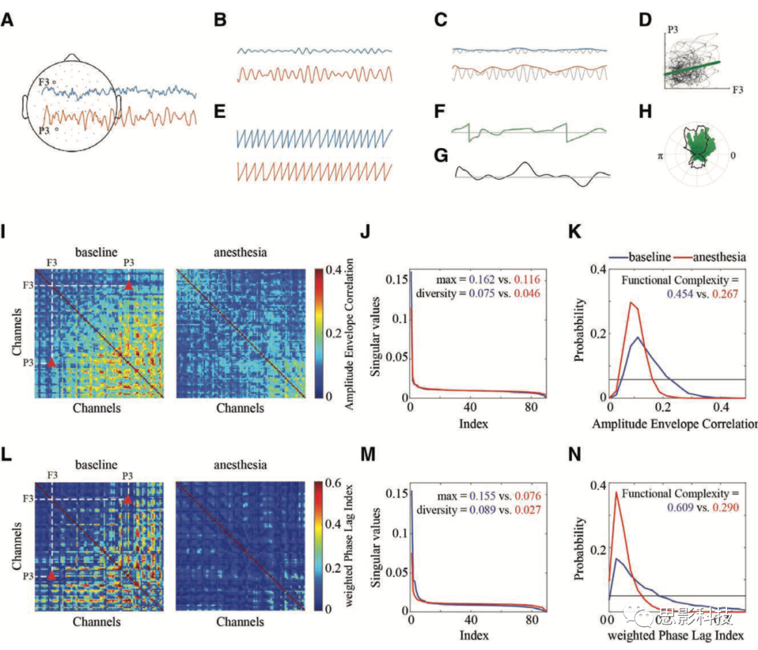 (J)基線和異氟烷麻醉時振幅包絡(luò)相關(guān)矩陣的奇異值、最大奇異值和奇異值的多樣性。(K)基線(藍色)和異氟烷麻醉(紅色)期間幅度包絡(luò)相關(guān)矩陣非對角值的概率和功能復(fù)雜度值。水平黑線表示均勻分布。