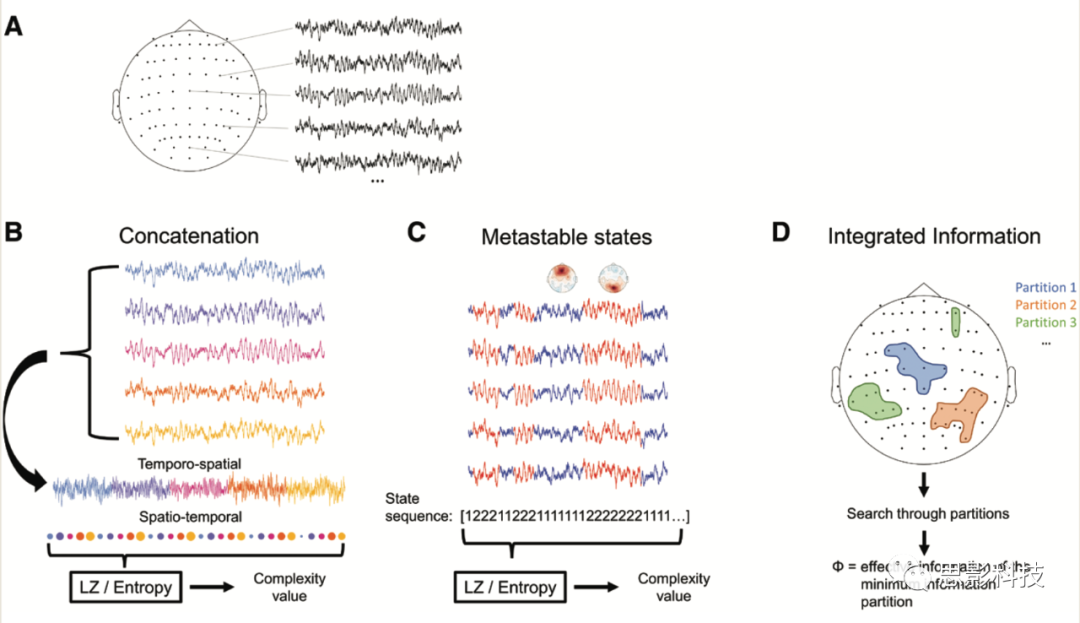 為了真正量化大腦活動的復(fù)雜程度,我們需要同時考慮空間維度和時間維度,使用多通道腦電圖(圖5A)。許多將時空信息結(jié)合起來產(chǎn)生時空復(fù)雜度的方法已經(jīng)被提出,但到目前為止,沒有一種方法被證明是最好的。大多數(shù)方法可以分為:連接、狀態(tài)切換或信息集成方法。