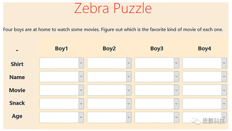 圖1.斑馬謎題,問(wèn)題下方有一些線(xiàn)索來(lái)幫助被試連接屬性和對(duì)象(boy)。一個(gè)示例線(xiàn)索是“Joshua在某一單元格選項(xiàng)的最后一個(gè)”,單擊單元格的箭頭會(huì)下拉該單元格的所有選項(xiàng)。